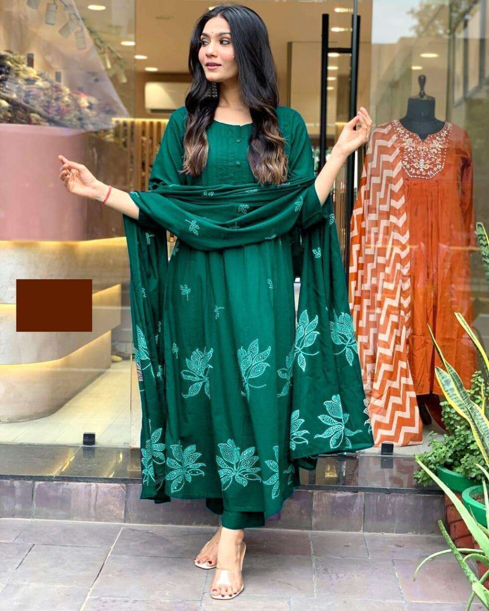Green Long Kurta having Discharge Floral Print and Printex, Pants & Dupatta Size-M